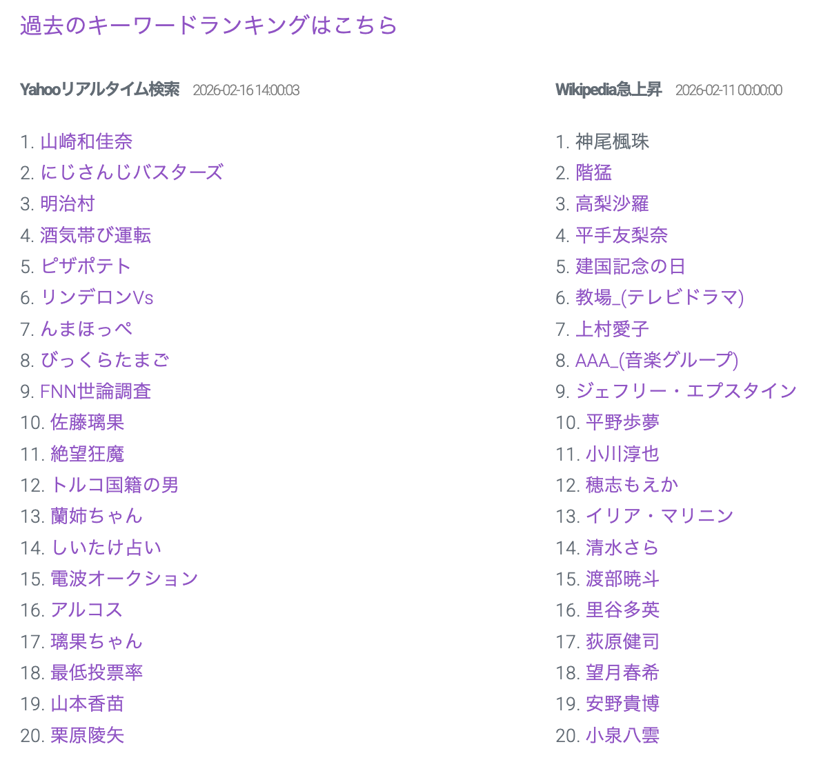 から話題のキーワードを収集し、ランキング形式で表示するサイトです。以前はGoogleトレンドや@nifty、dメニューなどのキーワードランキングも表示していましたが、現在は有料化されたり廃止されたりしたために、Yahooリアルタイム検索だけになっていました。ソースがひとつだけだと寂しいので、別のサービスがないか探してみたところ、Wikipedia急上昇ワードが1日毎に取得できることがわかったので、追加しました。